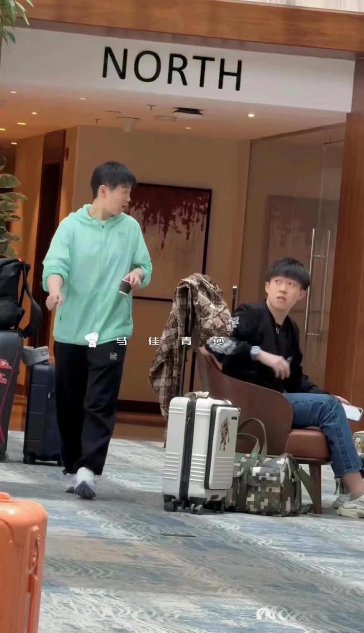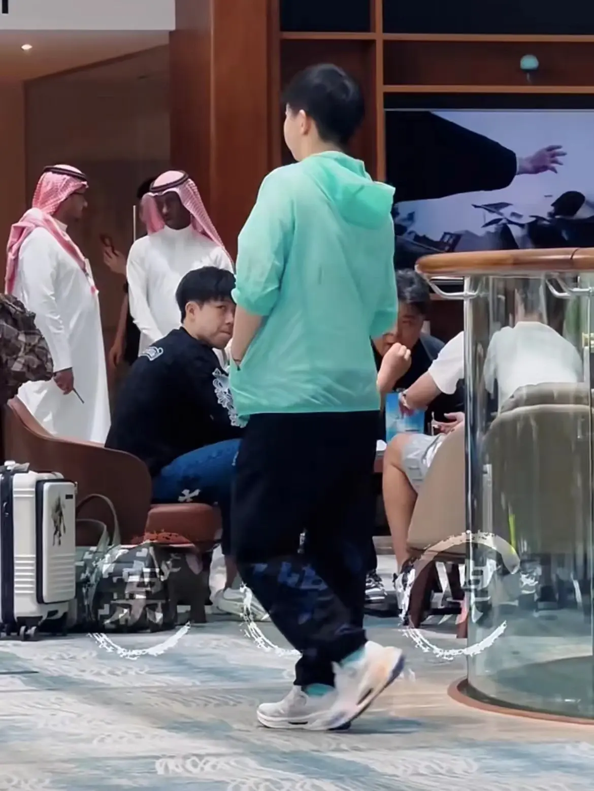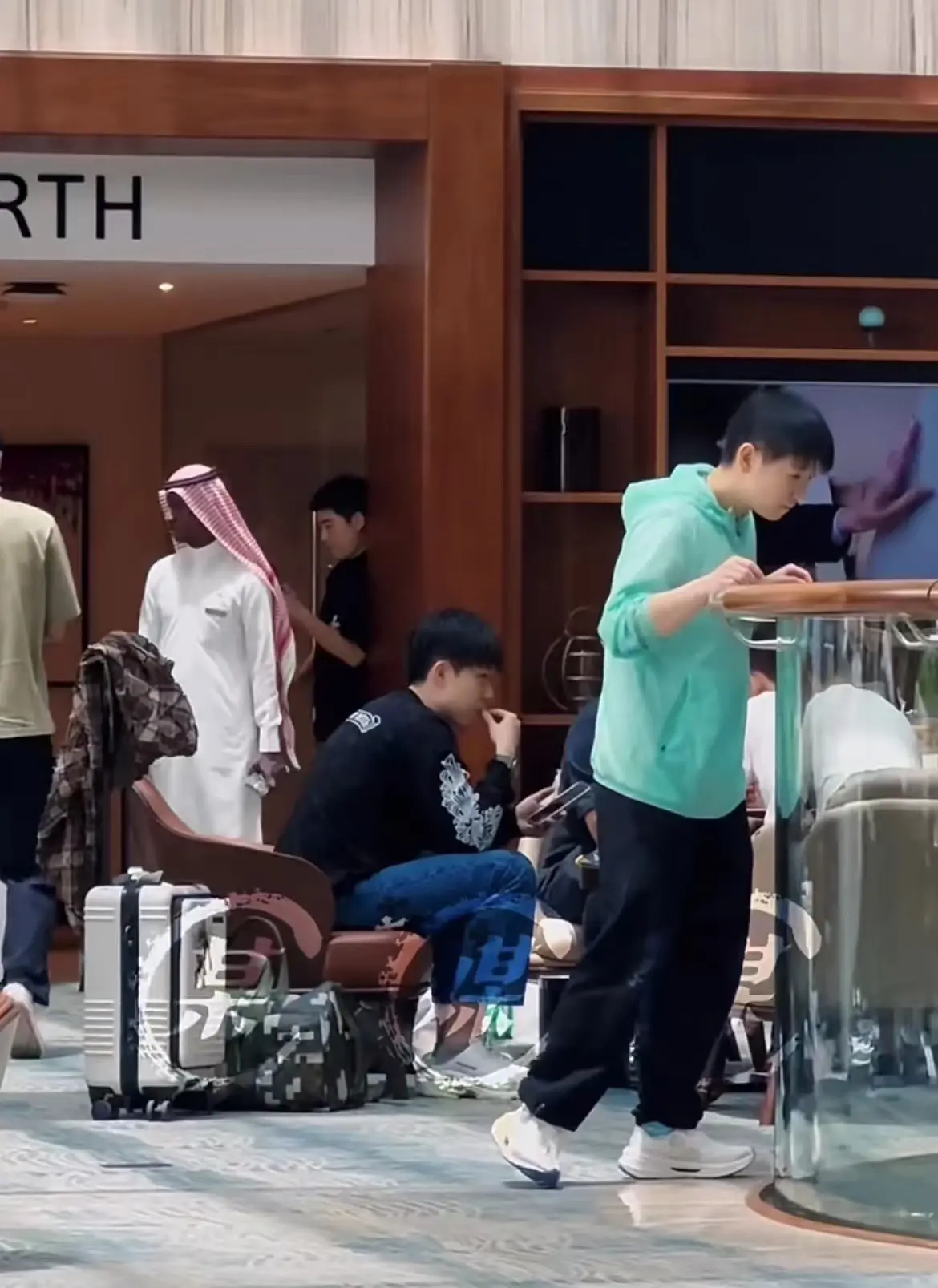 国乒大部队已经平安落地沙特吉达。大家正三三两两地坐在酒店大厅里等着办理入住手续。