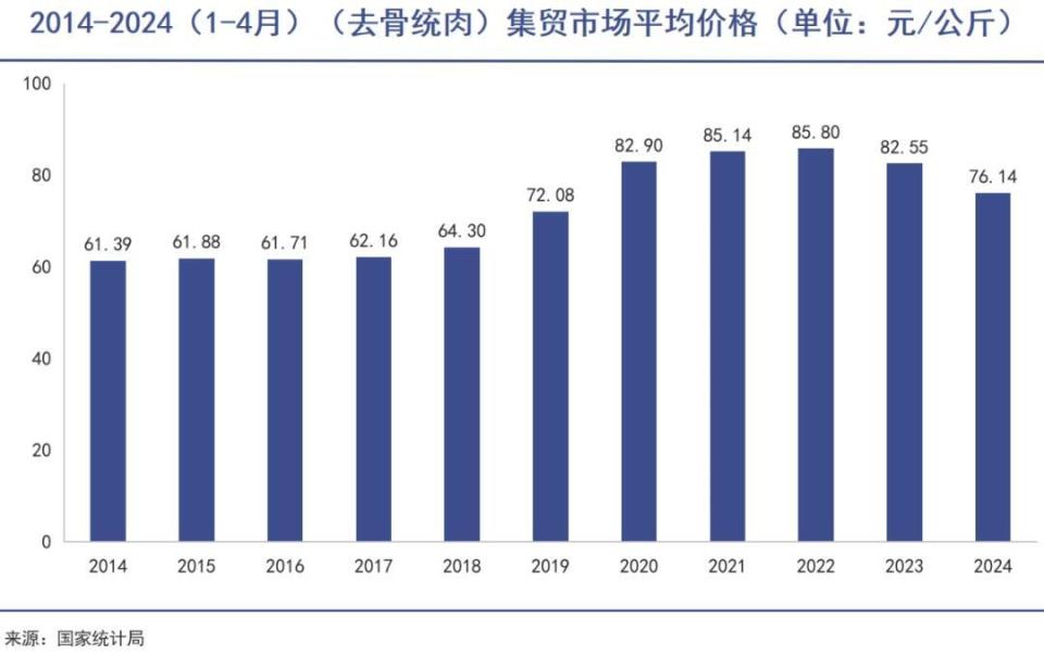 凭借旺盛的需求和潜力,牛肉价格在过去多年不断迈向新高。根据国家统计局数据,牛肉(去骨统肉)集贸市场年平均价格从2014年的61.39元/公斤,一直飙升至2022年的高点85.8元/公斤,涨幅接近40%。