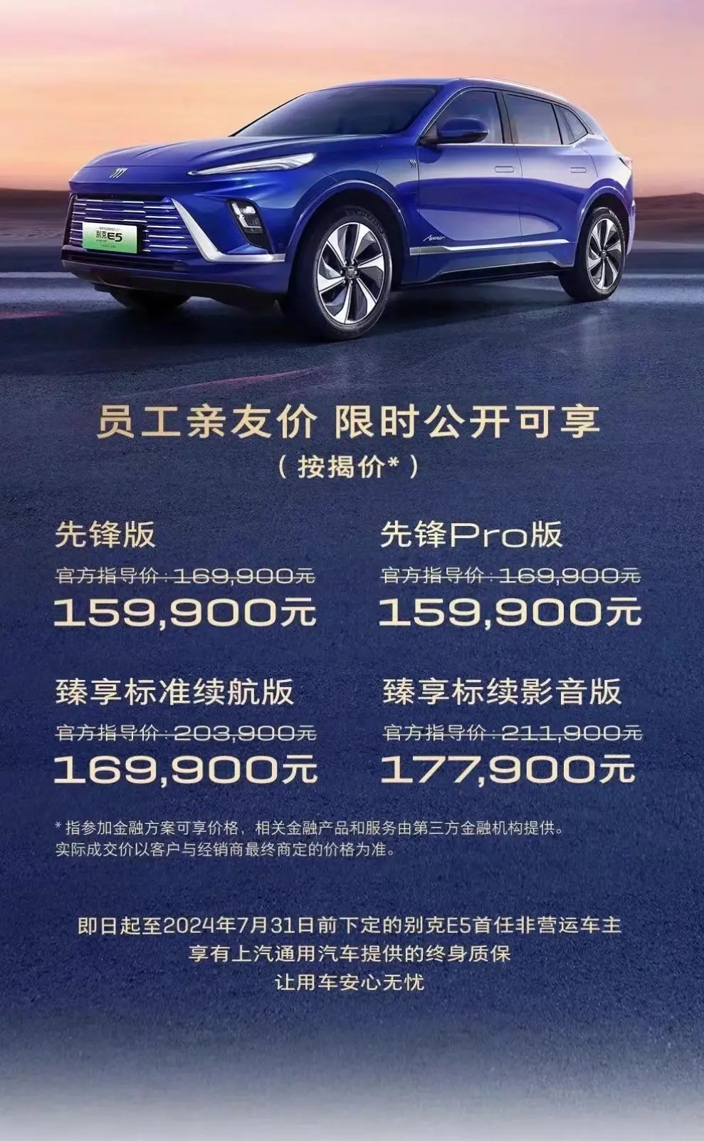 上汽通用别克品牌首款基于奥特能平台打造的纯电中大型SUV别克E5近日开启限时优惠活动。用户在2024年7月31日前下定并按揭购买,可享受至高3.4万元的优惠。根据官方公布的信息,此次参与别克E5限时优惠活动的共有4款车型,其中先锋版和先锋Pro版可优惠1万元,优惠后限时售价为15.99万元;臻享标准续航版和臻享标续影音版优惠3.4万元,优惠后限时售价分别为16.99万元、17.79万元。
