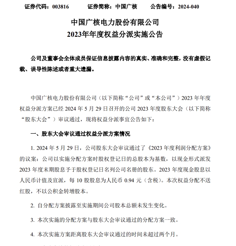 转载:http://stock.10jqka.com.cn/20240708/c659575076.shtml 2024-07-08 14:36:39 获悉,中国广核(003816)近日发布2023年年度权益分派实施公告。2023年度现金股息以人民币计值及宣派,每10股股息为人民币0.94元(含税)。本次权益分配不送红股,不以公积金转增股本。