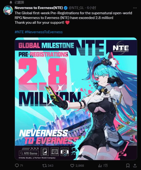 据俄罗斯媒体报道,中国游戏开发商Hotta Studio上周公布的新作《异环》引发了海外广泛关注。该游戏在开放预注册仅7天内,已吸引超过280万玩家参与。
