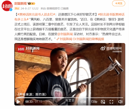 谈到因为《黑神话:悟空》的成功给陕北说书带来的热度,熊竹英表示这确实能为他们带来额外收入,但他也表示在热度过去后还是希望能够脚踏实地地做好艺术创作。