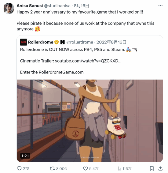 然而,来自Roll7开发工作室的一位前开发者却出人意料地建议大家不要购买,而是选择盗版。这位前员工Anisa Sanusi在X平台上发文,确认了Roll7关闭的消息,并表示:“祝我曾参与制作的最喜爱游戏《酷极轮滑》两周年快乐!请玩盗版,因为我们公司已经解散了,没人再为拥有该游戏的公司工作了。”