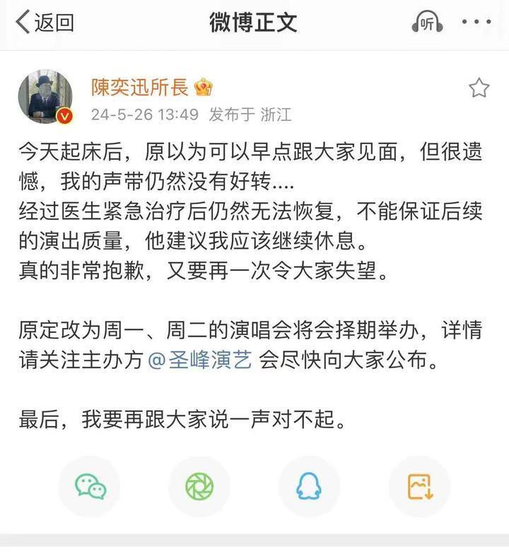 5月26日下午,陈奕迅和杭州站主办方再度发声,表示由于声带的问题,原定于延期到5月27日、5月28日的两场演唱会,将“择期举办”。
