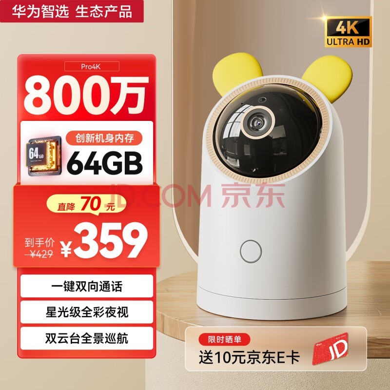 华为智选4K 800万摄像头家用监控器360度自动旋转带夜视全景语音手机远程看护母婴儿哭声侦测室内海雀云台