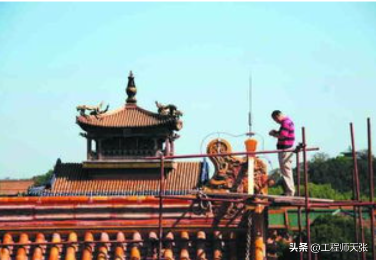 我们看看当前一些(仿)古建筑是怎么防雷的吧,这里主要谈谈外部防雷设计。其外部防雷装置通常分为三部分:接闪器、引下线、接地装置。