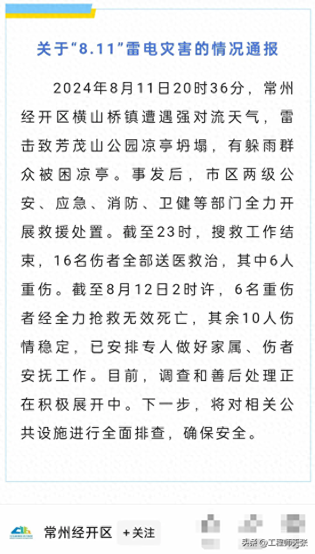 常州经开区通报了8·11雷电灾害致死伤事故情况,如下↓