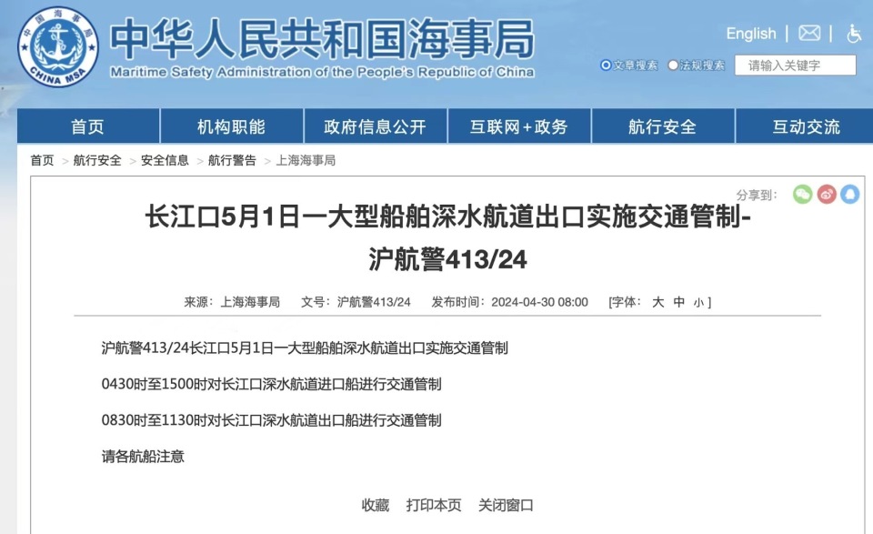 转载:https://new.qq.com/rain/a/20240430A026DQ00 2024-04-30 09:58·界面新闻·发布于北京 据中国海事局网站消息,上海海事局发布航行警告,长江口5月1日一大型船舶深水航道出口实施交通管制。东海5月1日7时至5月9日9时,在四点连线水域内进行军事活动。请各航船注意。