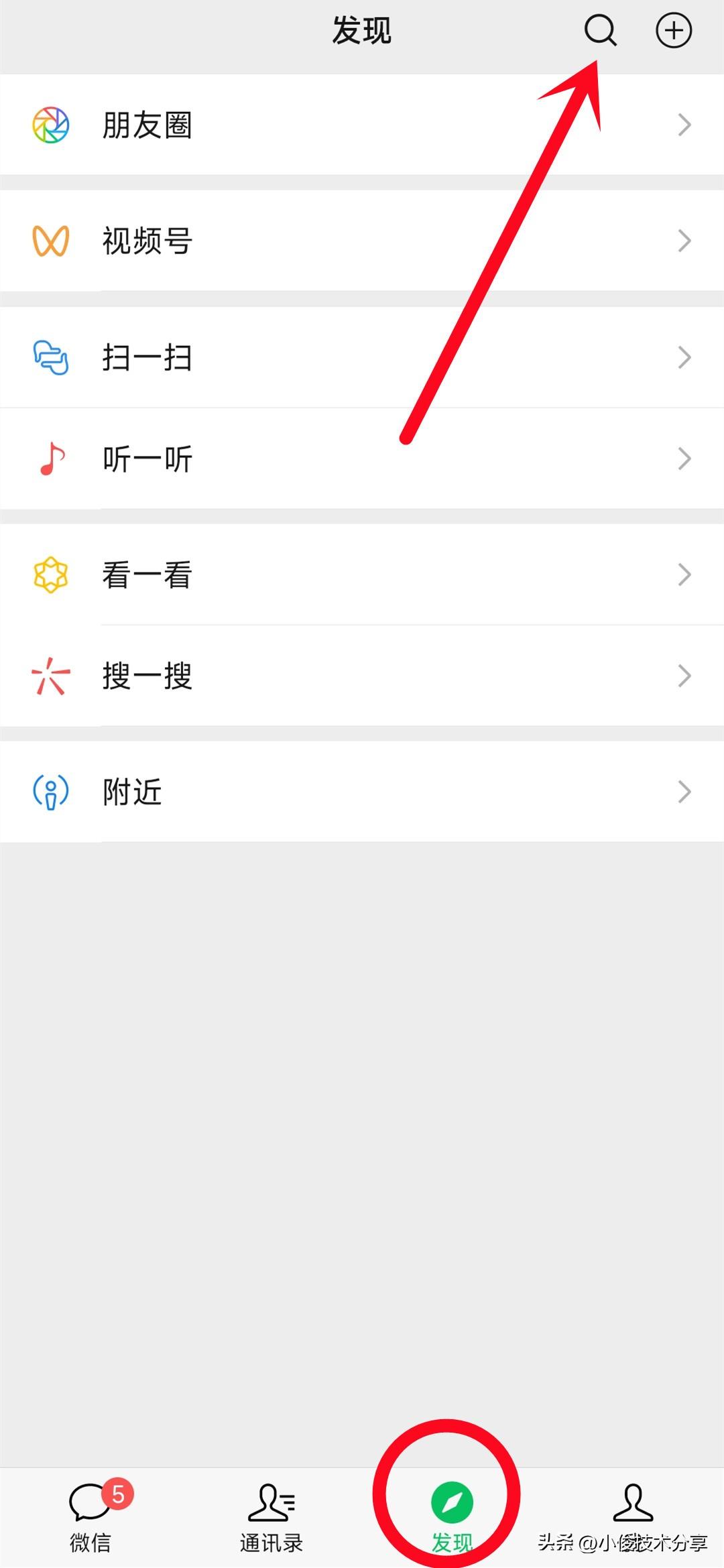 首先我们打开微信,然后点击中间的发现,接着可以看到在上面有一个放大镜,我们点击这个放大镜图标