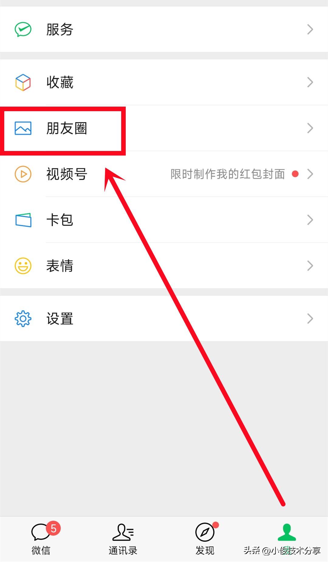 此时我们同样打开微信,接着点击右下角的我,然后点击上面的朋友圈