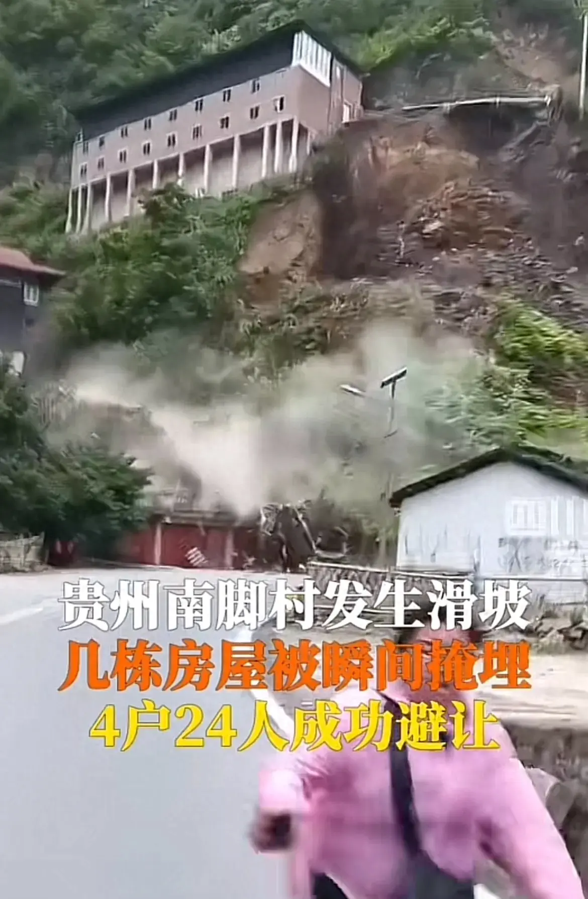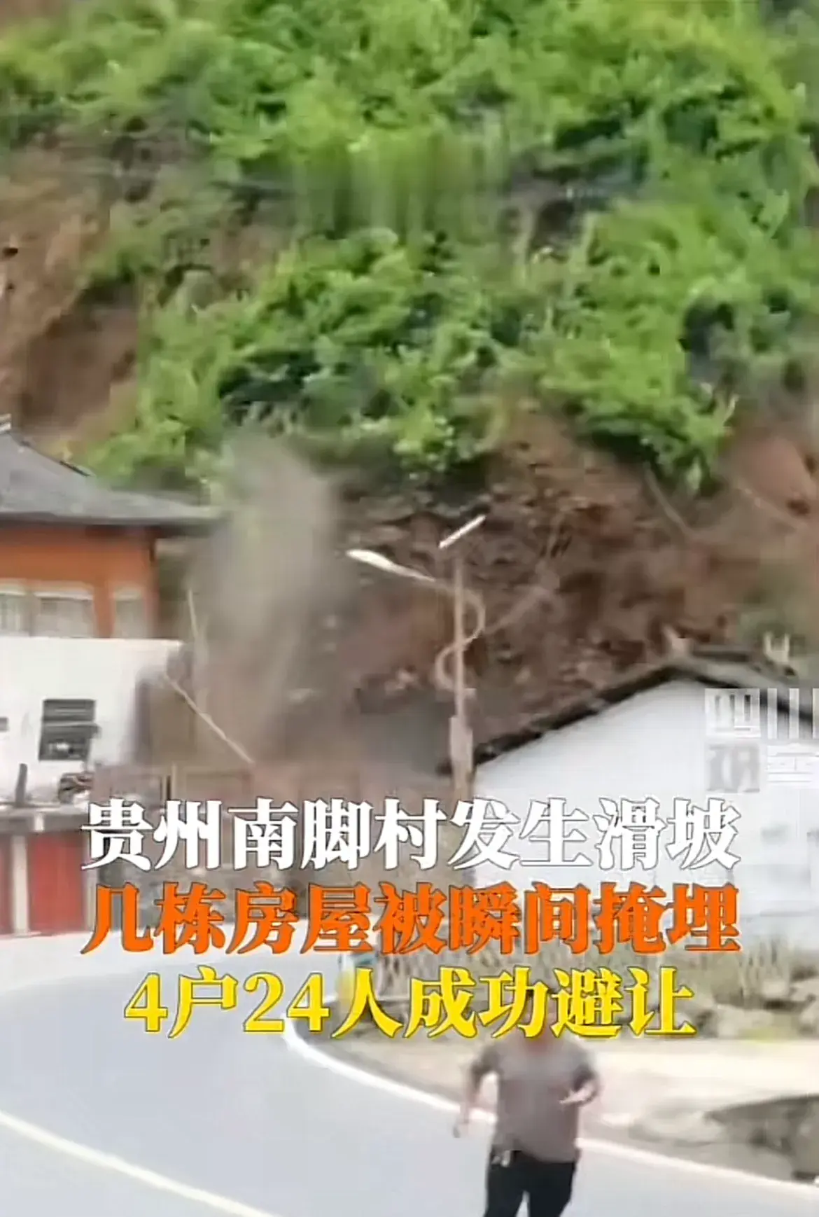 视频了解到,4月30日18时24分左右,贵州南脚村发生滑坡前后仅仅10秒钟,几栋山脚下的房屋被瞬间掩埋,令人庆幸的是这4户中有24人成功避让。