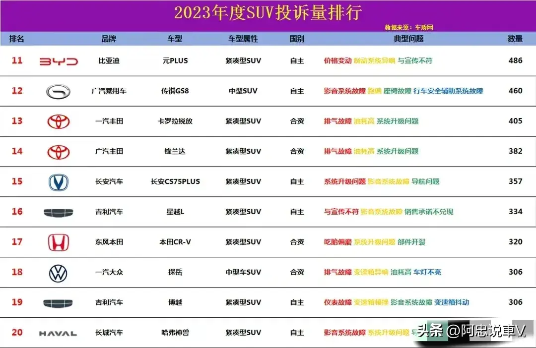 数据显示,投诉榜共20款车型,其中丰田车企有5辆,比亚迪4辆,长城汽车3辆,吉利汽车2辆,华晨宝马,上汽通用别克,广汽乘用车,长安汽车,本田汽车各一辆。买车别乱买,2023年SUV投诉榜TOP20,唐第2,汉兰达第10,CRV第17名!