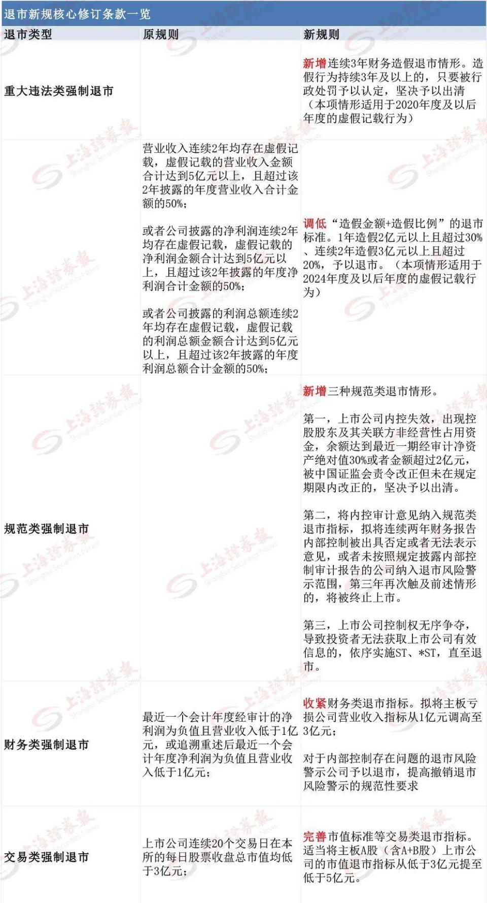 本次退市标准的修订,是在2020年退市改革的基础上进一步突出对财务造假、内控失效等乱象的威慑力度,完善对违法违规行为的全方位、立体化打击体系。其中,在此前2年连续造假达到一定比例强制退市的基础上,新增1年严重造假、3年及以上连续造假的情形,新增资金占用以及内部控制被出具无法表示意见或否定意见等退市标准。