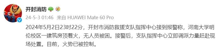 2024年5月2日23时22分,开封市消防救援支队指挥中心接到报警称,河南大学明伦校区一建筑房顶着火,无人员被困。接警后,支队指挥中心立即调派力量赶赴现场处置。目前,火势已被控制。