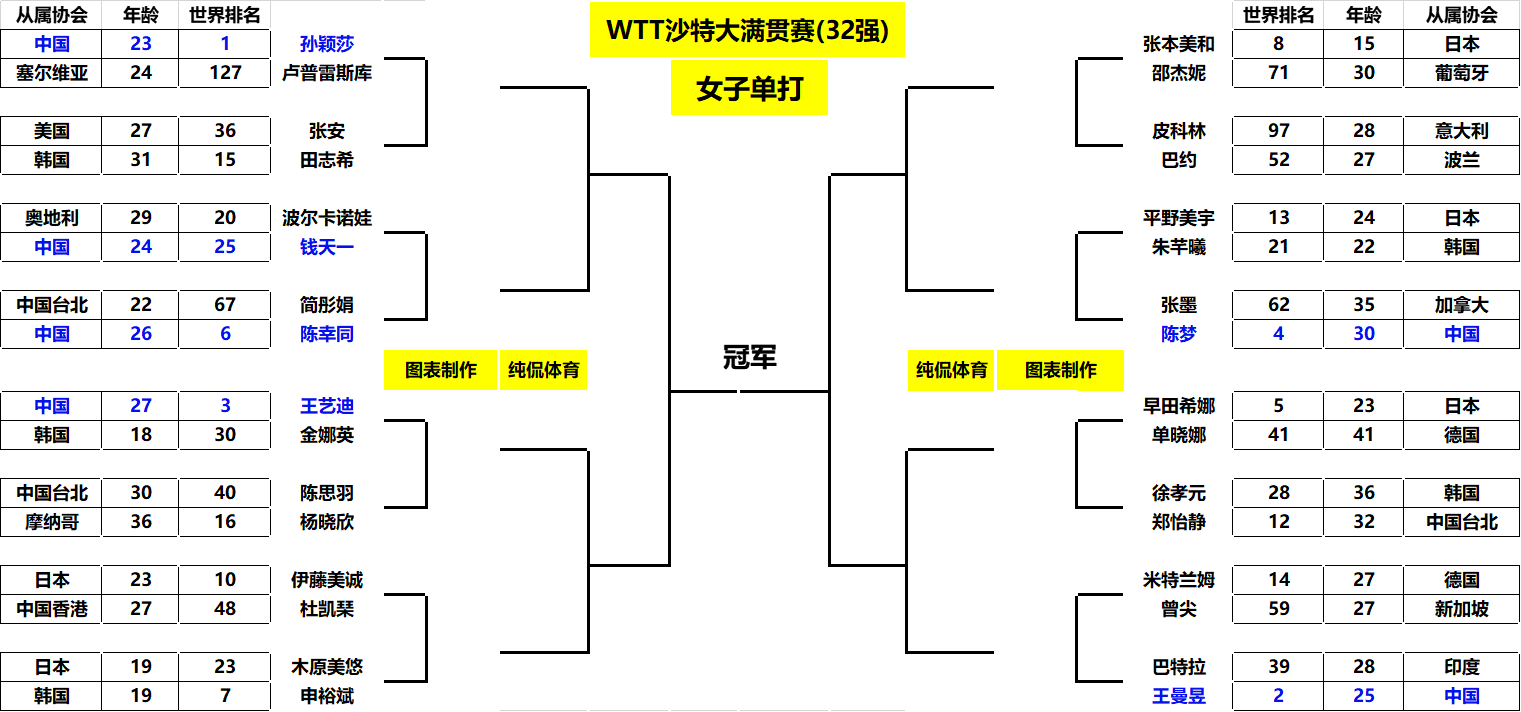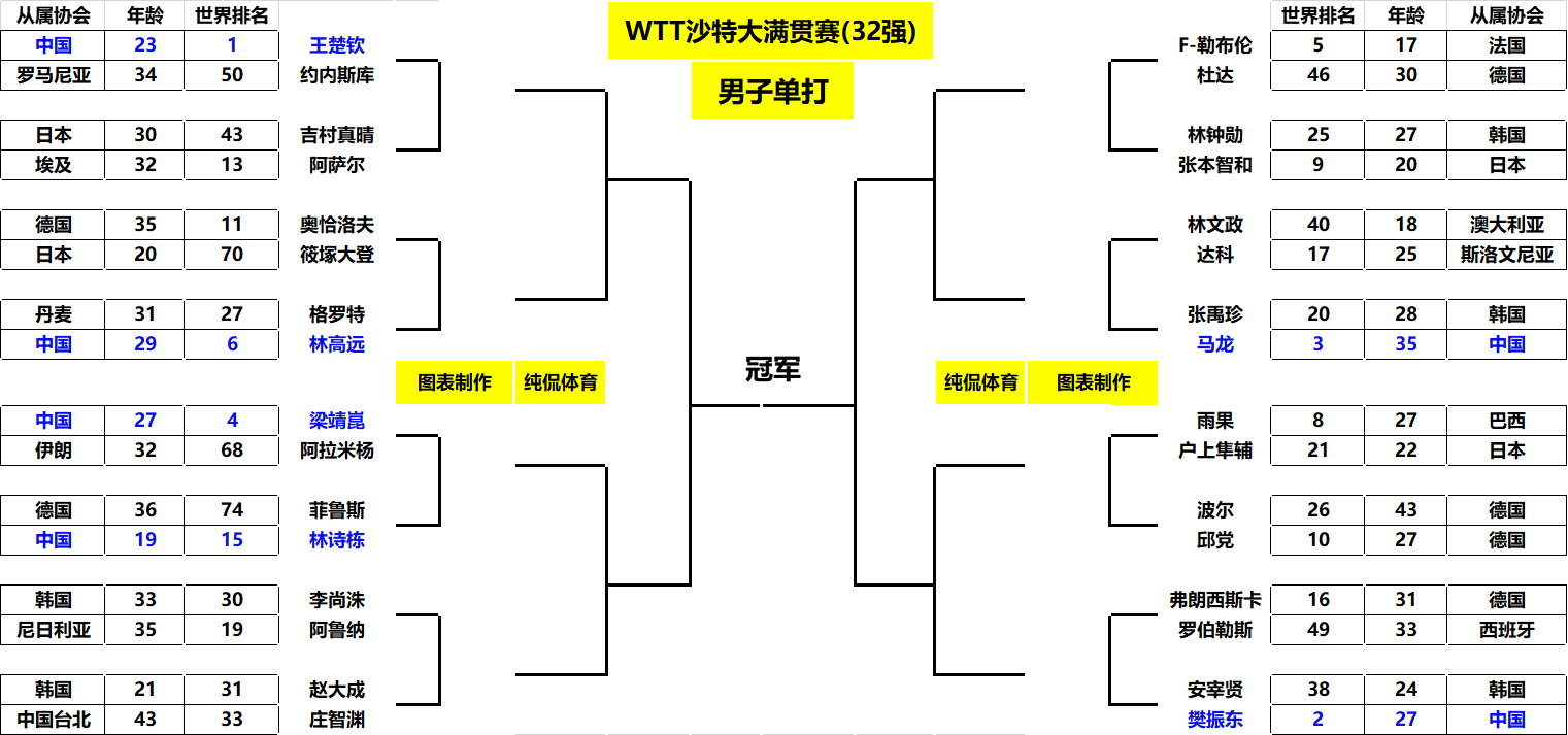 至此单打32强正式出炉(详情将如下如图表)!随着比赛的深入,过程将更加精彩纷呈!希望国乒球员在之后的比赛继续有高光的表现,在异国他乡捍卫国球荣光!