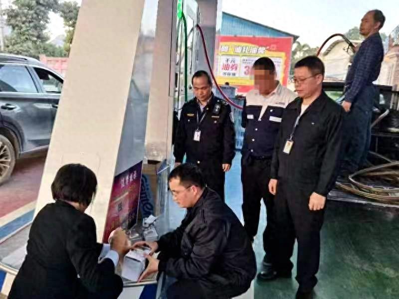来宾市市场监管局执法人员在加油站对成品油质量安全进行抽样。