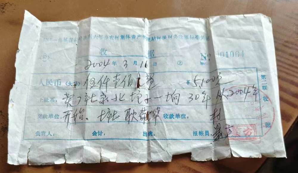 记者看到,这份收据显示:“卖七社家北坨子一晌地30年,从2004年开始”,上面盖有固鲁嘎村委会的公章。