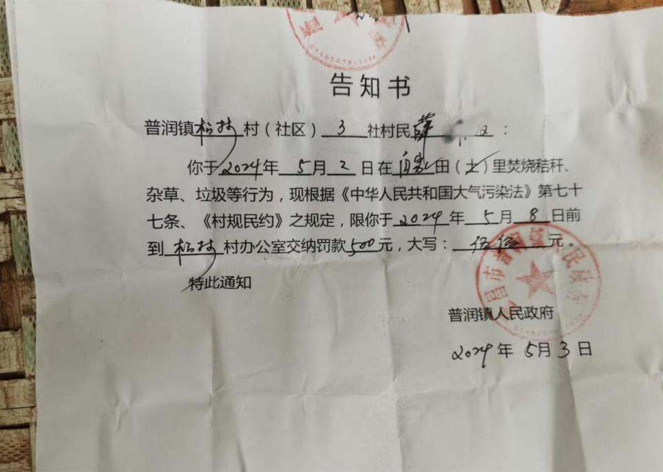 网友曝光的照片显示,落款为普润镇政府的一封告知书称:“普润镇松林村3社村民薛某于2024年5月2日在自家田里焚烧秸秆、杂草、垃圾等行为,现根据相关法律规定,限你于2024年5月8日前,到松林村办公室交纳罚款500元。”落款时间为2024年5月3日。