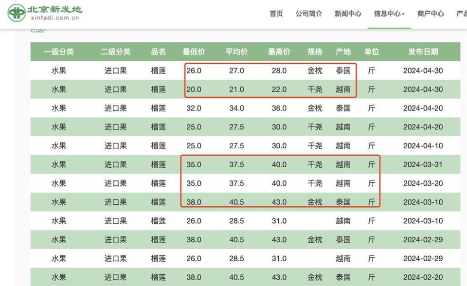 记者查询发现,批发端的榴莲价格确实出现明显下跌。据北京新发地市场官网,4月30日,干尧榴莲的平均价为21元/斤,相比3月20日的37.5元/斤,每斤下降16.5元;金枕榴莲的平均价格为27元/斤,相比3月10日的40.5元/斤,每斤下降了13.5元。