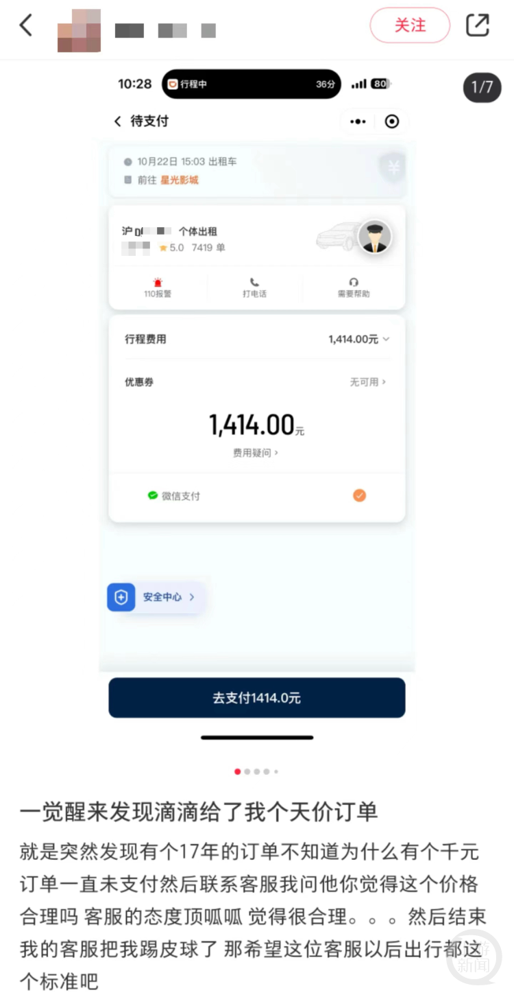12日,小关把这段经历发到网上,引来网友热议。有网友表示,“一共7分钟的路1400元?客服还不去反馈,还说就是?”也有网友推测,可能是司机输入14元时误输入成1414元。也有网友提醒,滴滴出行最好不要开通自动支付,要不费用有问题都发现不了。