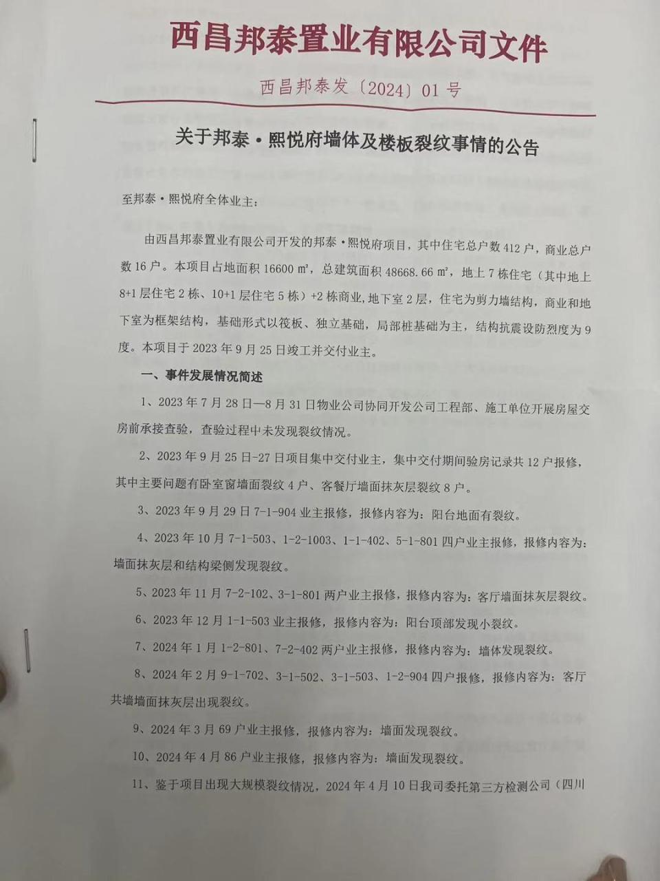 5月8日,西昌邦泰置业有限公司向邦泰·熙悦府全体业主发布《关于邦泰·熙悦府墙体及楼板裂纹事情的公告》(以下简称《公告》)称,2023年9月25日-27日,项目集中交付业主,集中交付期间验房记录共12户报修;2024年3月,69户业主报修,报修内容为:墙面发现裂纹;2024年4月,86户业主报修,报修内容为:墙面发现裂纹……