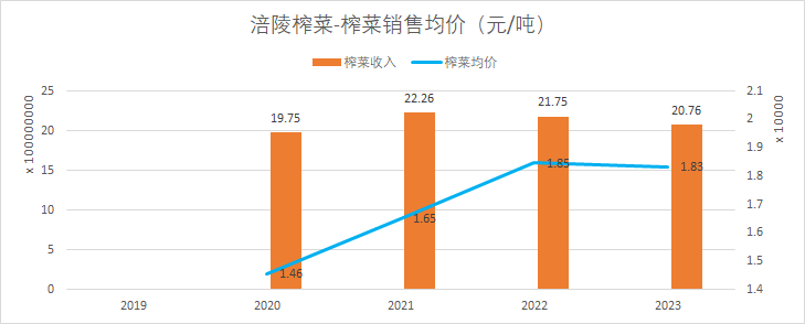 同期,涪陵榨菜的出厂销售均价,先是从2020年的1.46万元/吨经过连续两年的涨价,涨到2022年的1.85万元/吨,然后2023年降至1.83万元/吨。