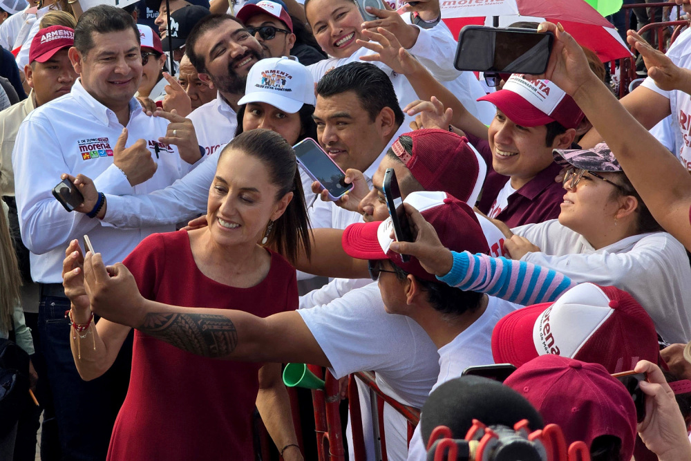 当地时间2024年5月25日,墨西哥普埃布拉,国家复兴运动党、绿色生态党和劳工党组成的“让我们继续创造历史”左翼联盟候选人欣鲍姆在集会上与支持者合影。墨西哥民众将于6月2日参加大选投票,欣鲍姆有望成为首任女总统。? 视觉中国 图