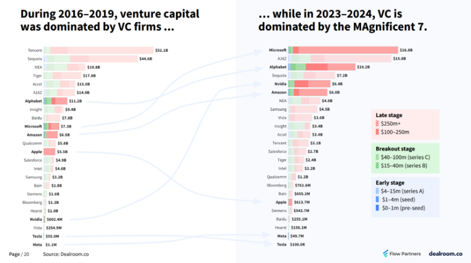 “七姐妹”在风险投资领域的活动显著增加,尤其是那些已经有一定规模和业绩但尚未上市的公司,到2023-2024年,它们已成为最大的科技VC。