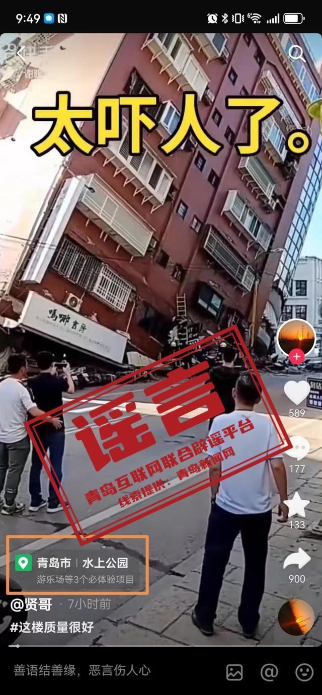 5月31日,名为“贤哥”的网友在短视频平台发布题为《太吓人了》的视频,视频中建筑楼体倾斜严重,现场有消防人员积极施救。视频发布的定位显示为青岛市即墨区通济街道水上公园。画面展示的情况危险,引发网民关注。经过记者调查并向有关部门求证,此事并非发生在青岛,视频来源是台湾省花莲县4月发生地震后的视频。