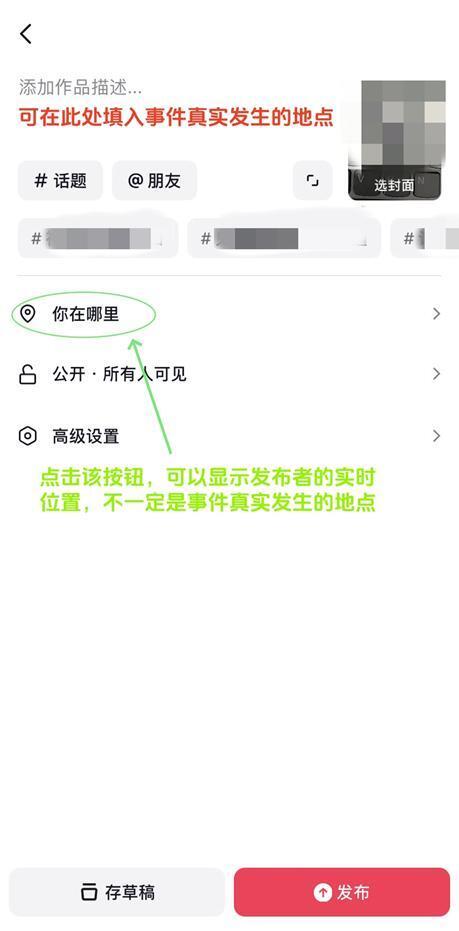以抖音平台为例。在用户上传视频信息时,页面会显示“作品描述”和“你在哪里”等内容框供用户填写。如果作者发布的视频并非当下所作,可在“作品描述”中写清事件发生的真实时间地点等。如果用户没有在“作品描述”中写明,而只选择“显示位置”,就会让人误以为用户发布的视频是在显示的位置上所发生,容易引起误会,甚至引发谣言。
