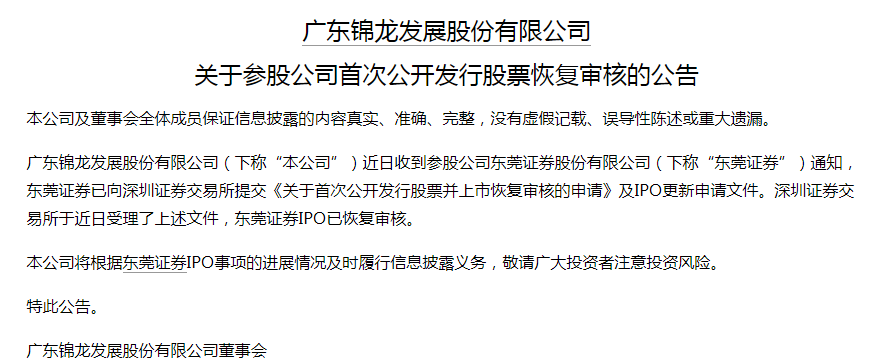7月1日,锦龙股份(000712)(000712.SZ)发布公告称,其参股公司东莞证券IPO已恢复审核状态。