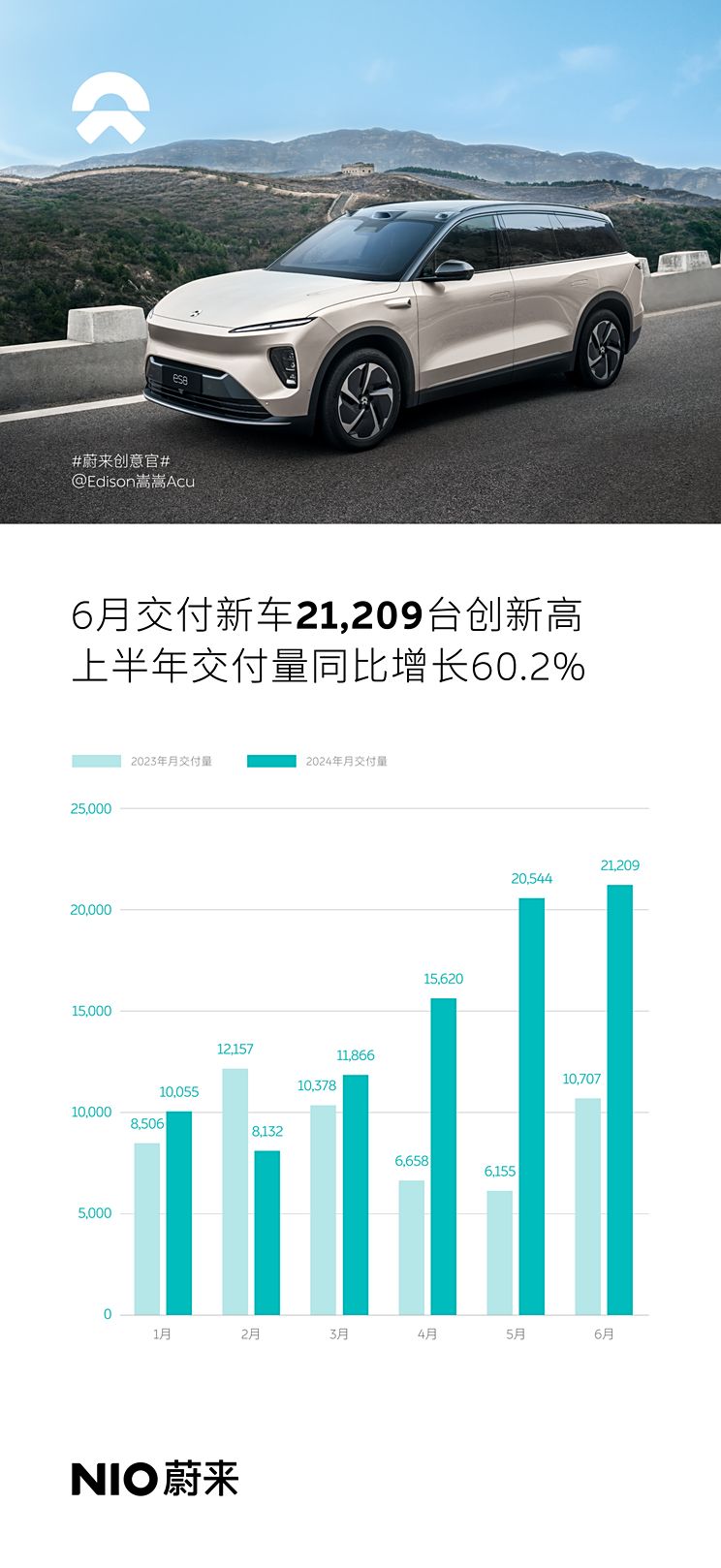 根据最新官方消息,6月蔚来交付新车21,209台,同比增长98%,创历史新高。此外,蔚来已累计交付新车537,020台。