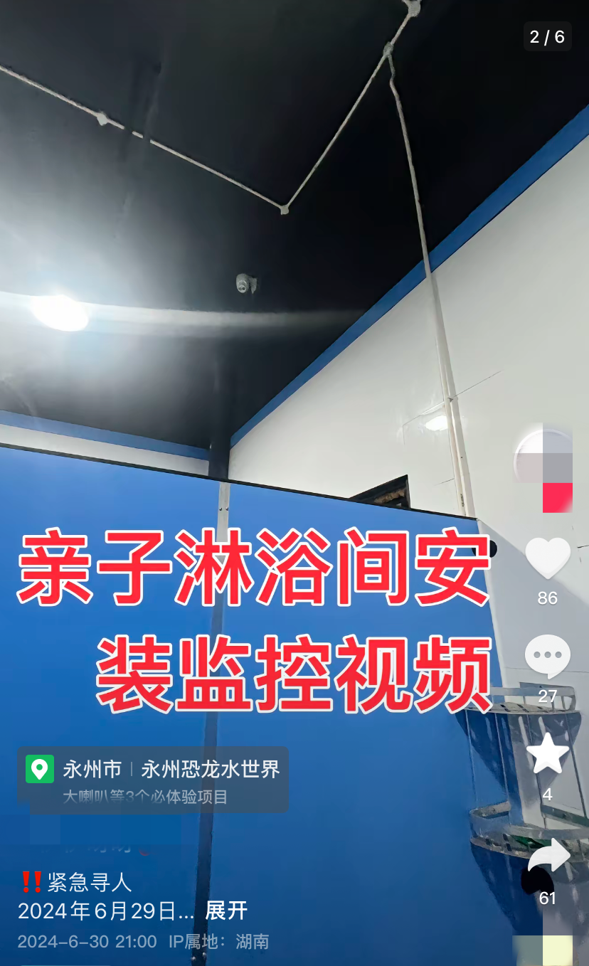 近日,有网友发视频称,在湖南永州恐龙水世界亲子沐浴区内,一位母亲带5岁男孩洗浴更衣后,发现该沐浴间内安装了摄像头。7月1日,该景区工作人员表示,该亲子淋浴间专供成年女士带男童使用,装摄像头是为了保护未成年人。