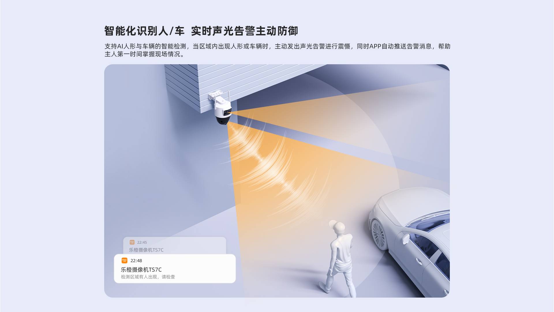在安全性方面,TS7C同样表现出色,它采用了红蓝灯+白光灯+警笛三重警戒设计,当检测到异常情况时,四颗大功率双晶灯与红蓝警戒灯将同时亮起,形成强烈的视觉冲击,有效威慑可疑人员,警示效果更强。而且还会第一时间推送报警消息到手机app,有效防止意外情况发生,保证关键区域的安全。