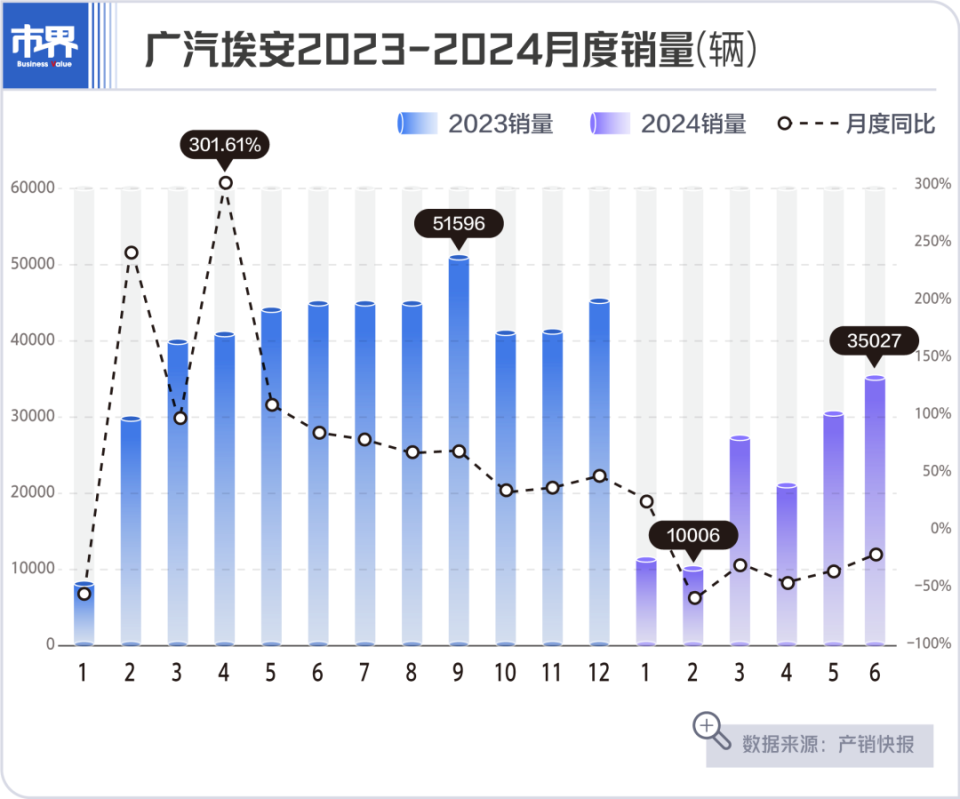 而且7月1日,广汽埃安公布了6月全球销量为35027辆,比去年同期下降了22.18%。