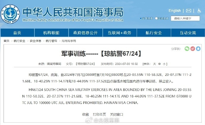 转载:https://new.qq.com/rain/a/20240706A085KK00 2024-07-06 22:29·北京日报客户端·发布于北京 据中国海事局网站消息,清澜海事局发布航行警告,7月7日8时至7月10日8时,南海部分海域进行军事训练,禁止驶入。 ???来源 @央视军事编辑 胡德成流程编辑 刘伟利