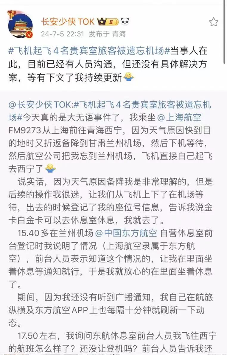 近日,“飞机起飞四名贵宾室旅客被遗忘机场”话题冲上微博热搜。7月7日,涉事旅客@长安少侠TOK发布微博再次回应此事,其表示已于7月6日21时许收到来自“中国东方航空公司服务管理部”的书面道歉函,整件事情有了初步的解决。