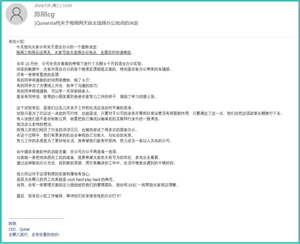 转载:https://new.qq.com/rain/a/20240709A03Z9K00 2024-07-09 12:44·界面新闻·发布于山西 据去哪儿网官方信息平台,7月9日,去哪儿CEO陈刚发全员信宣布,从7月15日起,每周三、周五,员工可以灵活选择办公地点。陈刚在信中强调,员工按规定混合办公,“无需任何申请审批”。