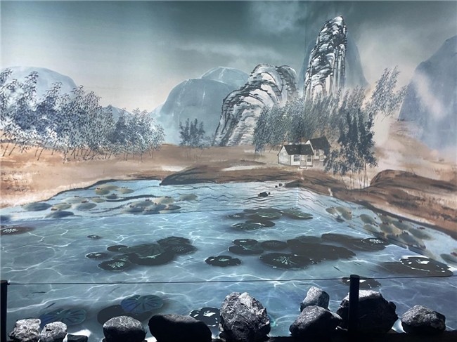 步入《万竹山居》展区,十余台极光系列投射出清流潺潺、鱼虾欢游的自然之趣,与竹林、轻雾、木桥虚实相映,传递作者的莼鲈之思,营造文人理想的隐居生活。卷轴造型的“画纸”上,铺满光影笔墨,生动描绘白石先生在不惑之年《五出五归》的经历,绘就“身即山川而取之”的山水大美。《一花一世界》以大师笔下的花鸟鱼虫为蓝本,在巨幅折幕中光影再现白石先生苍劲有力的书法、运笔凝重的花鸟大写意,致广大而尽精微,还原白石丹青的天趣画境。