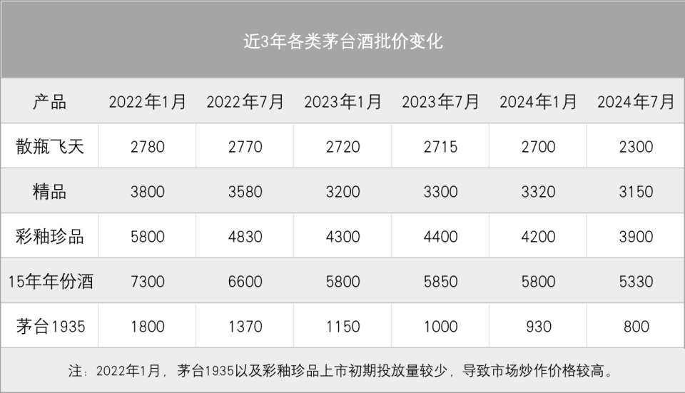 今年以来,茅台核心大单品散瓶飞天最大价格差超600元,精品、彩釉珍品、15年年份酒以及茅台1935均出现了不同程度的下滑,其中彩釉珍品已经跌出了定位的4000元价格带,茅台1935也在远离1000元价格带的目标。