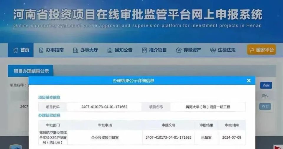 近日,河南省投资项目在线审批监管平台网上申报系统的项目办理结果公示显示,黄河大学(筹)项目一期工程,由郑州航空港经济综合实验区(以下简称“郑州航空港”)经济发展局(统计局)审批,并且已备案。