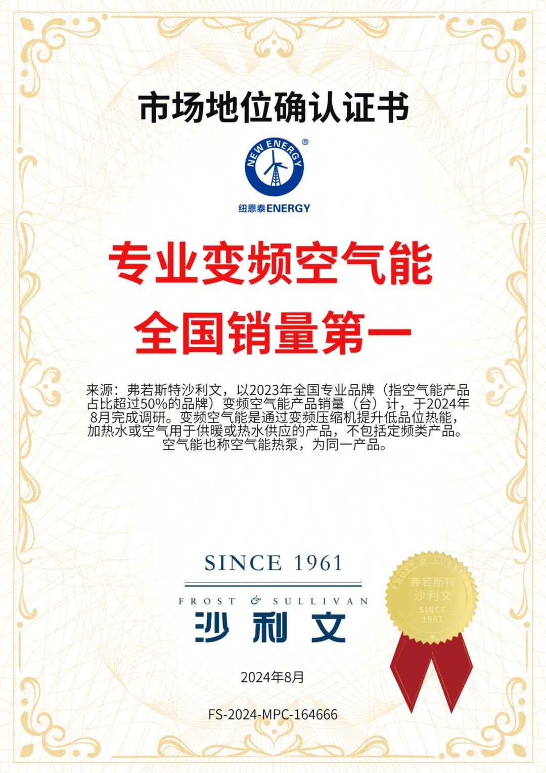 要问当今新能源哪个最火?空气能绝对是绕不开的话题。因为高效节能、环保安全的种种优势,空气能产业和相关的品牌都成为市场关注的重点。日前,全球权威市场调查机构弗若斯特沙利文发布了最新市场报告。报告显示,纽恩泰凭借其卓越的产品性能和出色的市场表现,荣获“专业变频空气能全国销量第一”的市场地位认证。
