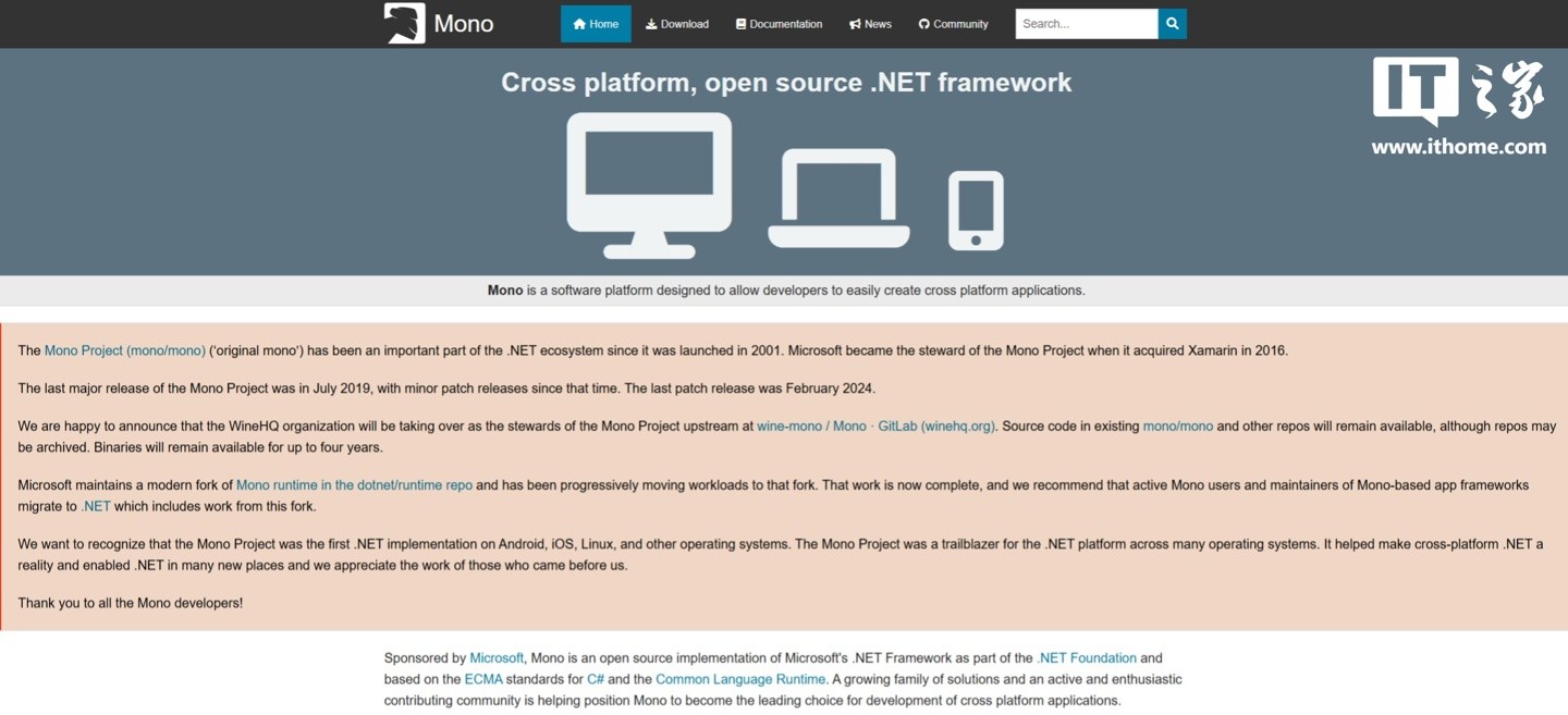 近日,微软宣布将Mono项目移交给WineHQ组织。Mono是一个开源的.NET框架,支持多种操作系统,包括Linux、macOS、Windows以及一些嵌入式系统。该框架允许开发者在非Windows平台上运行.NET应用程序。