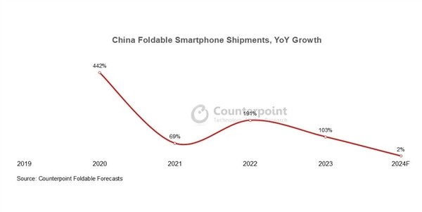 据市场研究机构数据显示,自折叠屏智能手机进入中国市场以来,销售额迅速增长。然而,当前这一行业的增长率已经逐渐放缓。预计到2024年,中国折叠屏手机的出货量将达到910万部,同比增长仅为2%。