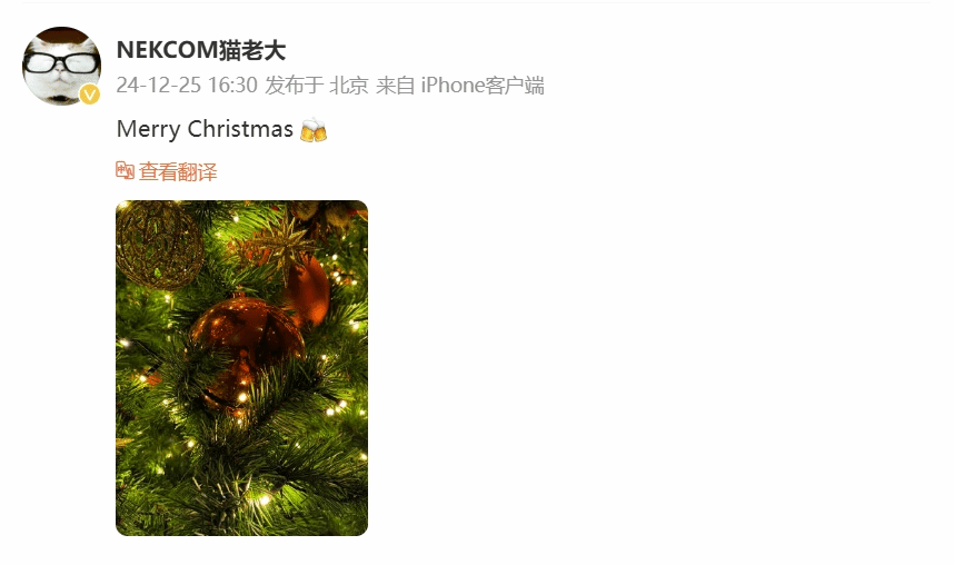 今日,负责《昭和米国物语》创意指导和制作统筹的“猫老大”在微博上发布圣诞贺图,祝大家圣诞快乐。图片中的圣诞树反光装饰隐约显露出他的身影。自游戏公布以来,因其独特世界观和深厚的文化内涵吸引了众多玩家的关注。今年,《昭和米国物语》发布了新的预告片,预计将于2025年登陆PC及PS5平台。这款游戏巧妙融合了80年代美国与日本的文化特色,创造出一个打破常规、富有颠覆性的全新世界,在这里,重生的少女蝶子将开始她的冒险旅程。