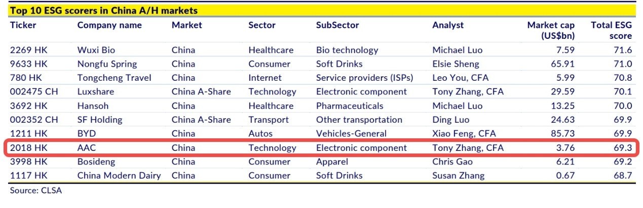 近日,里昂证券发布《中国ESG市场前景》报告,公布了ESG得分排名前十的中国A/H股公司,瑞声科技、比亚迪、顺丰、农夫山泉等公司上榜,覆盖科技、快消、汽车等领域。