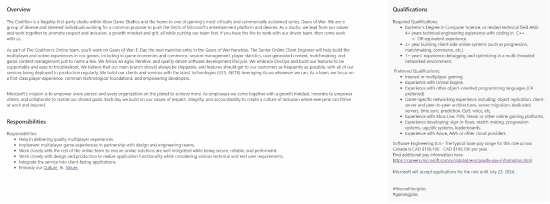 近日,游戏开发商The Coalition发布了一则招聘广告,寻找一名“高级在线客户端工程师”,加入《战争机器:事变日》的开发团队。该职位的主要任务是参与多人游戏和在线体验部分的设计与开发,包括游戏内经济体系、交易系统、聊天系统、玩家社区等内容。