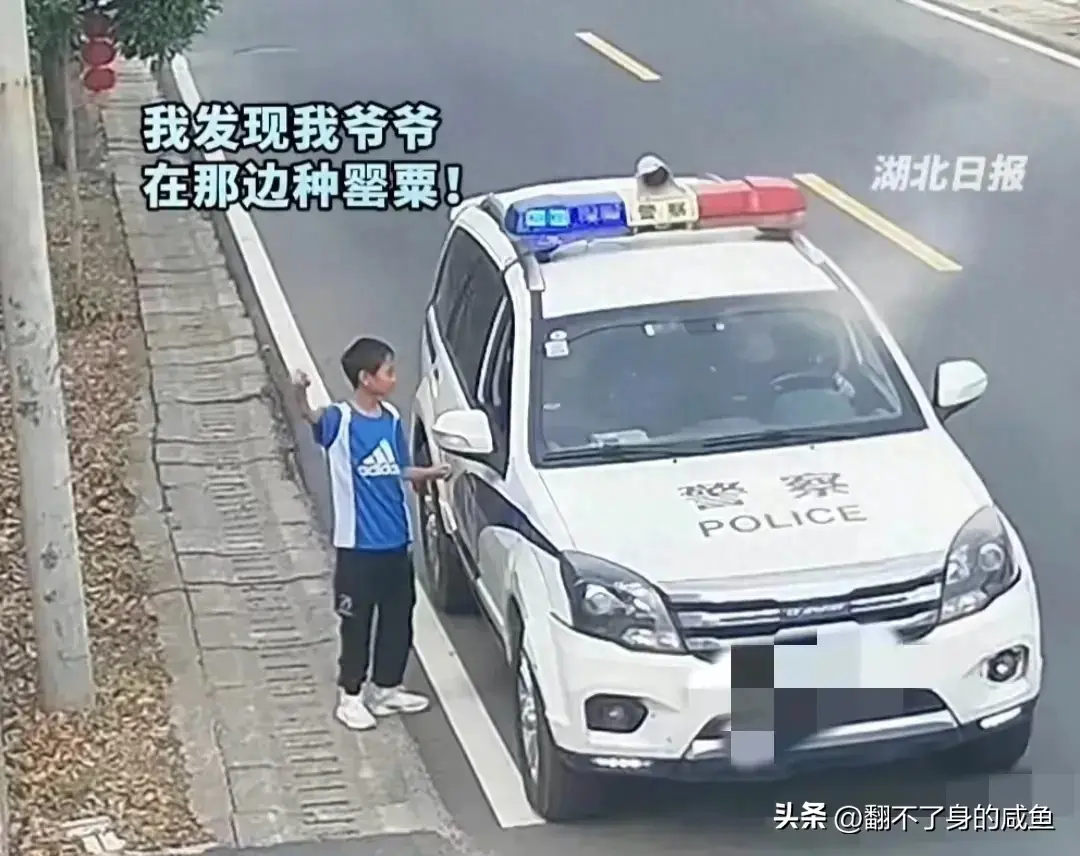 4月24日,湖北谷城,一名身穿蓝白衣服黑色裤子的男孩子,在路边拦住了路过的警车,并向民警举报称:自己的爷爷在菜园子里私自种植罂粟。