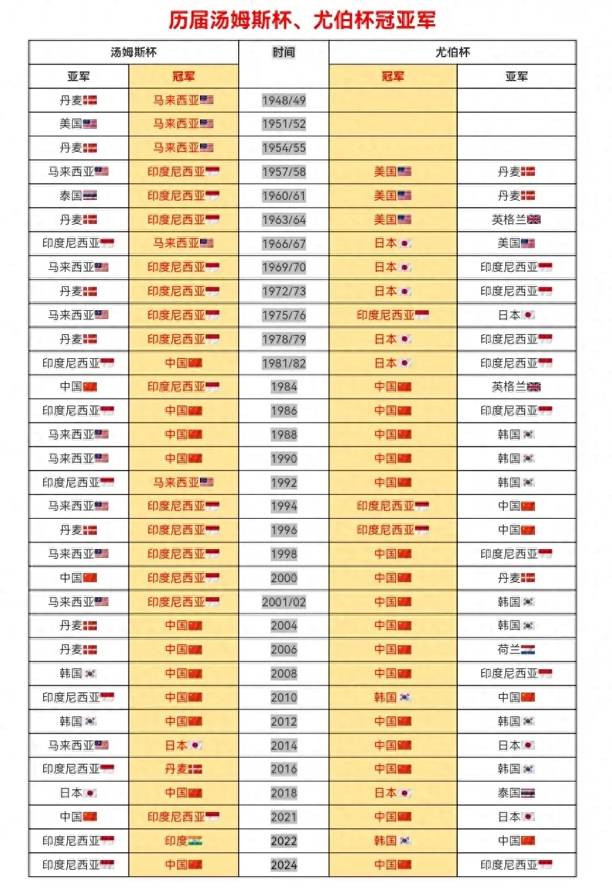 六、两个国家(协会)同时闯入汤杯、尤杯决赛的只有3次,分别是1986年的中国和印尼,2012年的中国和韩国,2024年的中国和印尼。这三次,中国都包揽了冠军!