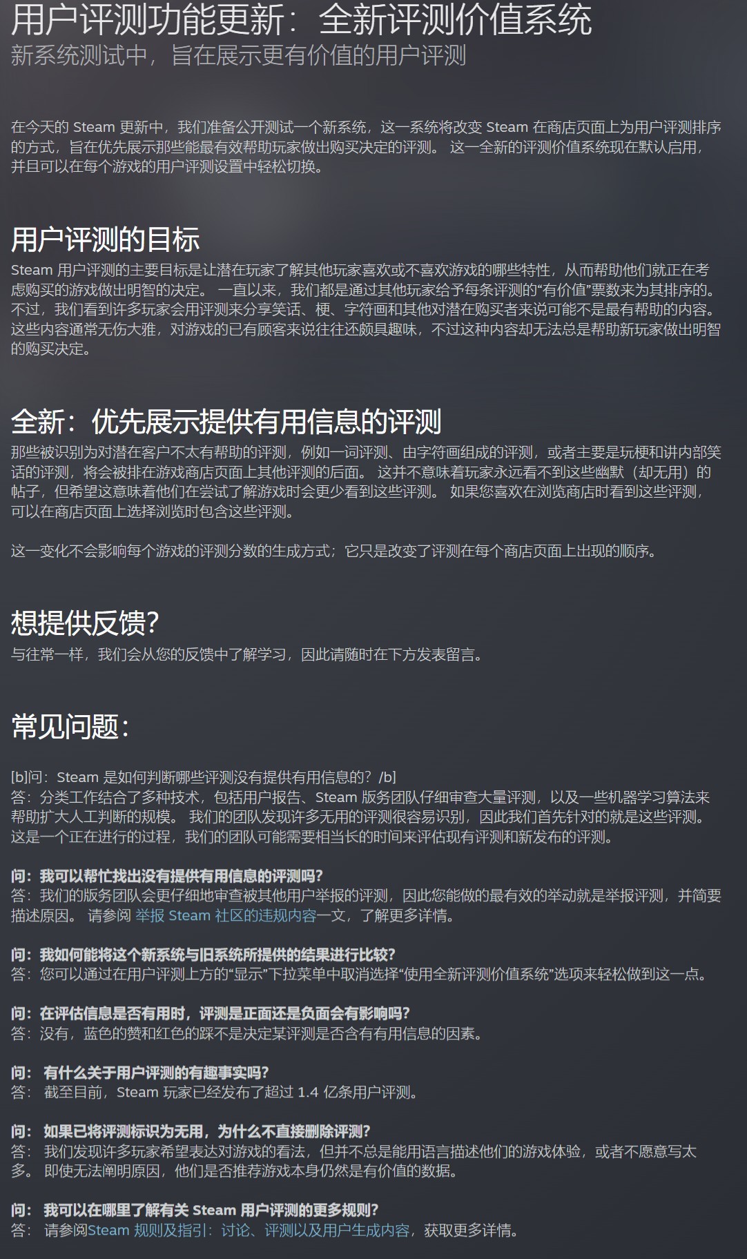 Steam用户评测系统更新,现已默认优先展示更有价值的用户评测。那些被识别为对潜在用户不太有帮助的评测,例如一词、字符画,玩梗和讲内部笑话的评测,将会被排在其他评测的后面。玩家也可以通过“显示”菜单中切换评测设置。
